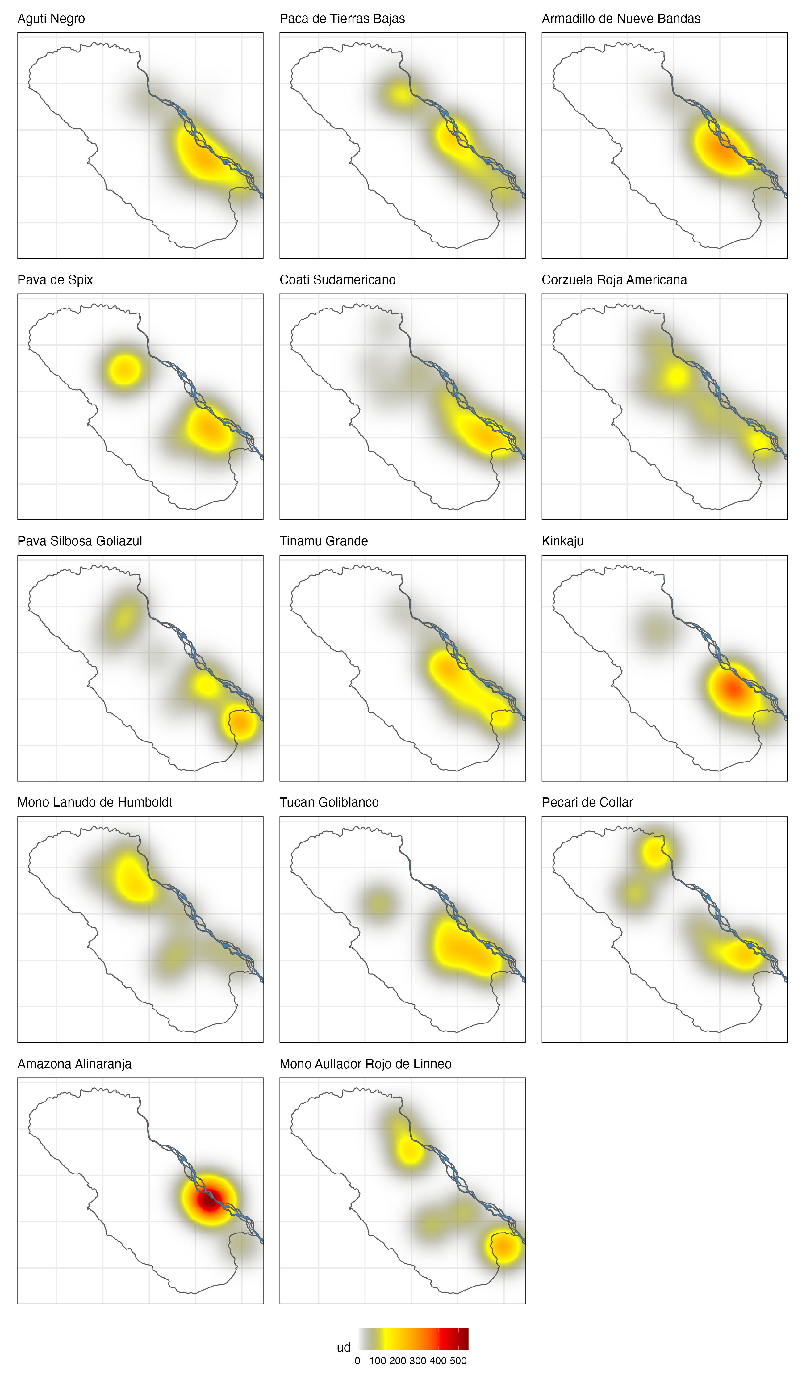 Con base en los registros espaciales de cada excursión de caza, se generaron mapas de calor (heatmaps) que muestran la distribución de los sitios donde fueron cazadas las distintas especies. Estos mapas permiten visualizar patrones espaciales de caza dentro del territorio, identificando áreas de mayor concentración de capturas y comparando la intensidad de caza entre especies. Esta aproximación facilita un entendimiento más claro de la relación entre las prácticas de caza, la disponibilidad de fauna y el uso del espacio por parte de los cazadores.
